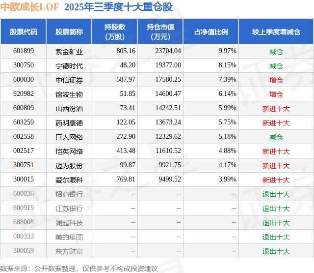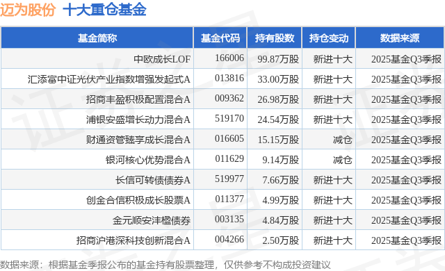 根据2025基金Q3季报公募基金重仓股数据,重仓该股的公募基金共14家,其中持有数量最多的公募基金为中欧基金的中欧成长LOF。中欧成长LOF目前规模为21.03亿元,最新净值2.2623(12月30日),较上一交易日下跌0.31%,近一年上涨41.88%。该公募基金现任基金经理为王培 尹为醇。王培在任的基金产品包括:中欧创新成长灵活配置混合A,管理时间为2018年3月26日至今,期间收益率为88.83%;中欧启航三年混合A,管理时间为2019年12月24日至今,期间收益率为49.43%;中欧责任投资混合A,管理时间为2020年9月10日至今,期间收益率为-3.48%。尹为醇在任的基金产品包括:中欧创新成长灵活配置混合A,管理时间为2021年3月20日至今,期间收益率为-8.74%;中欧责任投资混合A,管理时间为2022年7月7日至今,期间收益率为5.16%;中欧成长领航一年持有混合A,管理时间为2022年7月7日至今,期间收益率为7.8%;