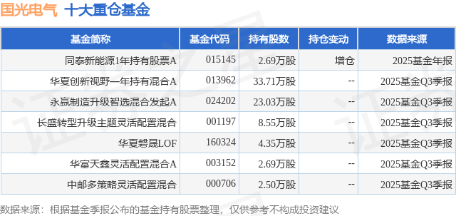 根据2025基金年报公募基金重仓股数据,重仓该股的公募基金共1家,其中持有数量最多的公募基金为同泰基金的同泰新能源1年持有股票A。同泰新能源1年持有股票A目前规模为0.2亿元,最新净值1.4394(1月8日),较上一交易日上涨1.88%,近一年上涨86.67%。该公募基金现任基金经理为陈宗超。陈宗超在任的基金产品包括:同泰数字经济股票A,管理时间为2021年7月27日至今,期间收益率为27.4%;同泰行业优选股票A,管理时间为2023年4月7日至今,期间收益率为-17.14%;同泰慧利混合A,管理时间为2025年5月12日至今,期间收益率为30.12%;