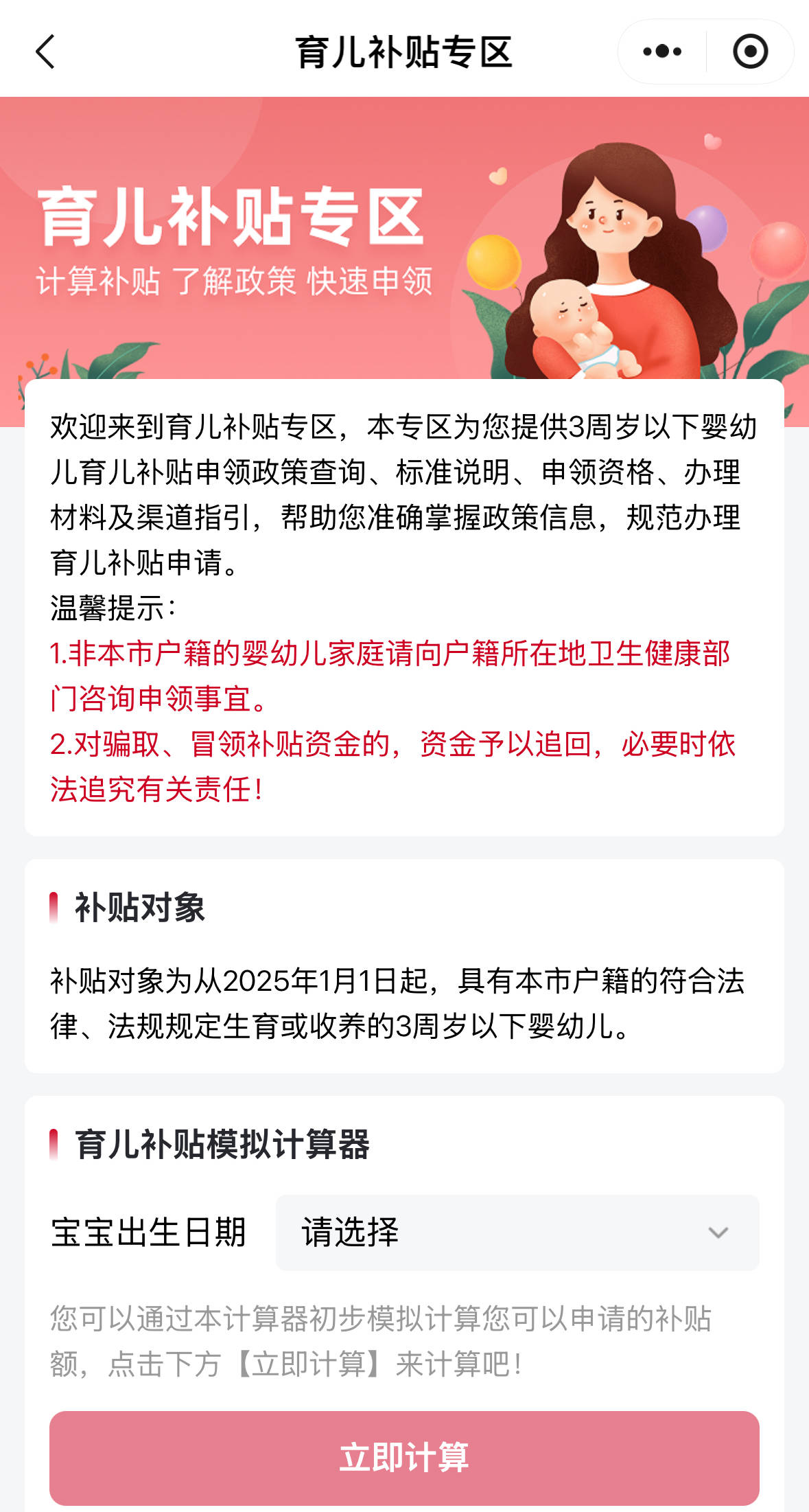 2025年9月底,北京市卫生健康委员会、北京市财政局联合印发《北京市育儿补贴制度实施细则(试行)》。规定从2025年元旦起,北京市户籍且符合法律法规规定生育或收养3周岁以下婴幼儿的家庭,可申领育儿补贴。按每孩每年3600元的标准,发放至婴幼儿年满3周岁。