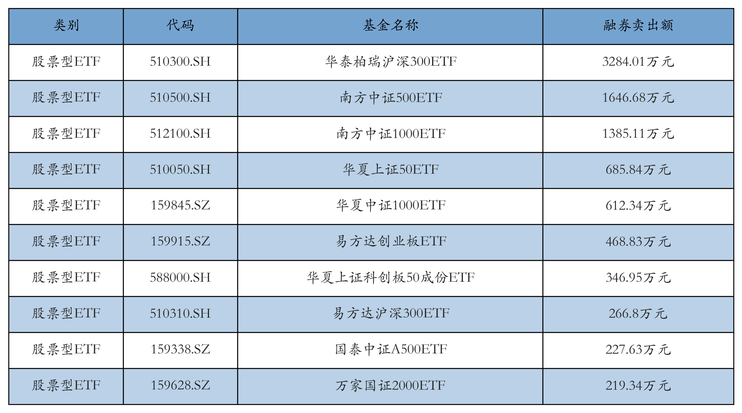 昨日股票型ETF融资卖出额最高的3只ETF及其卖出金额分别为:华泰柏瑞沪深300ETF(3284.01万元)、南方中证500ETF(1646.68万元)、南方中证1000ETF(1385.11万元)。融券卖出额前10详情见下表: