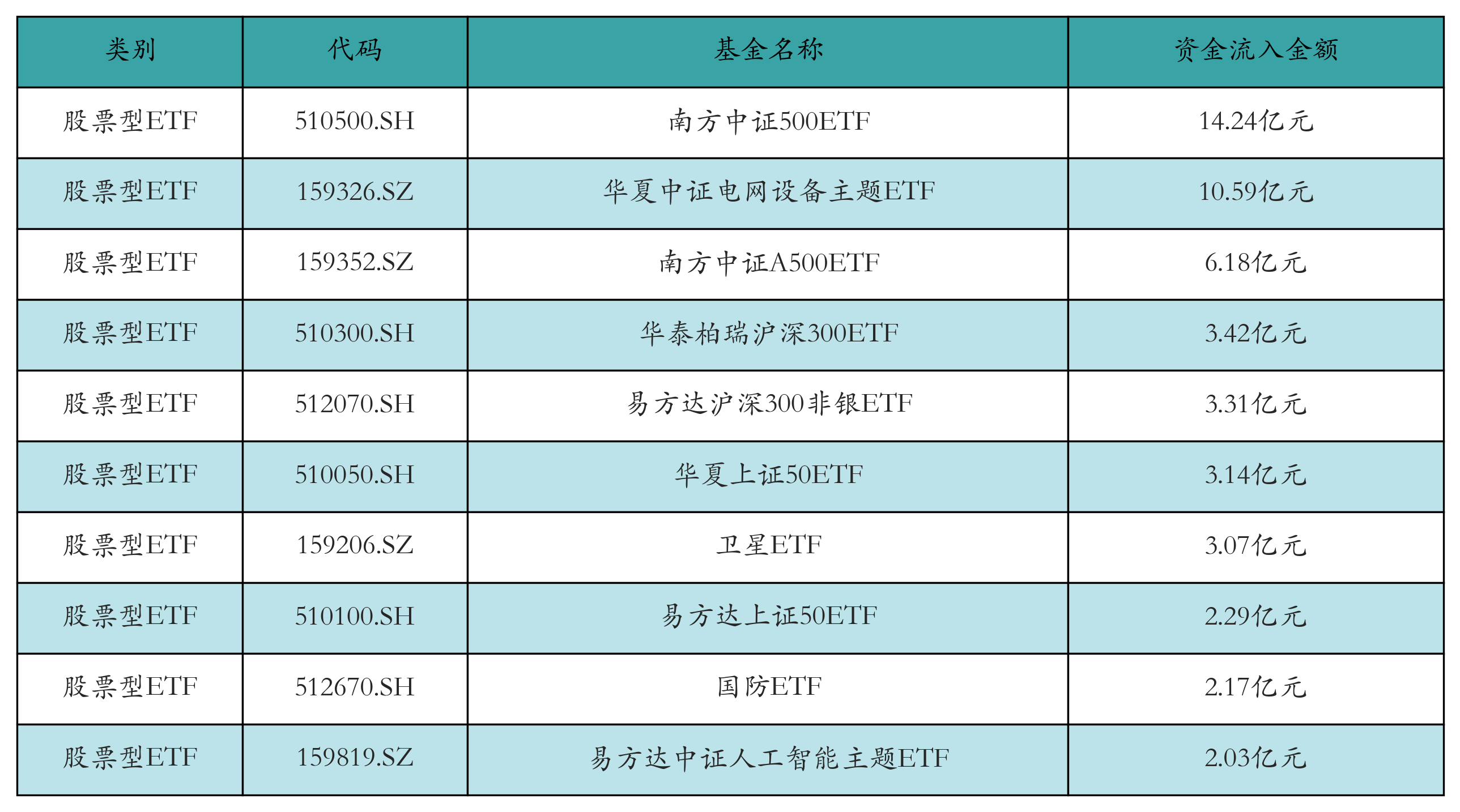 昨日股票型ETF资金流入最多的3只ETF及其流入金额分别为:南方中证500ETF(流入14.24亿元)、华夏中证电网设备主题ETF(流入10.59亿元)、南方中证A500ETF(流入6.18亿元)。资金流入前10详情见下表: