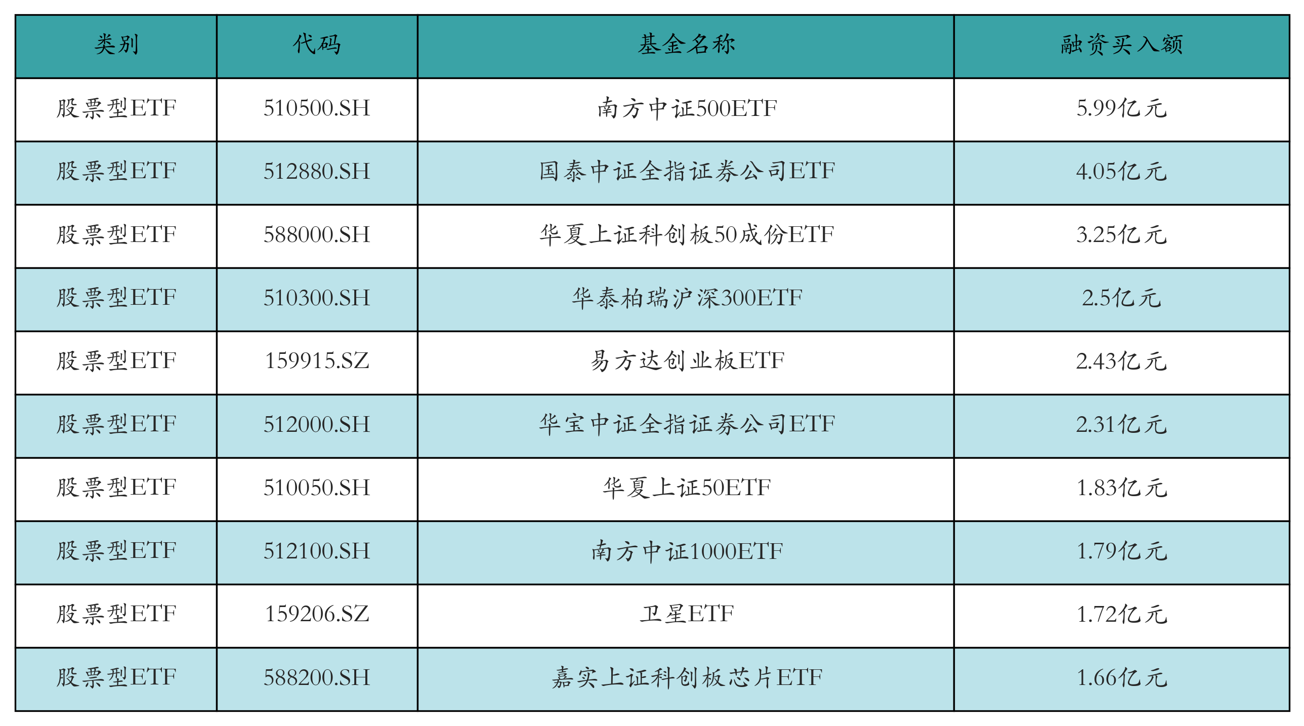 昨日股票型ETF融资买入额最高的3只ETF及其买入金额分别为:南方中证500ETF(5.99亿元)、国泰中证全指证券公司ETF(4.05亿元)、华夏上证科创板50成份ETF(3.25亿元)。融资买入额前10详情见下表: