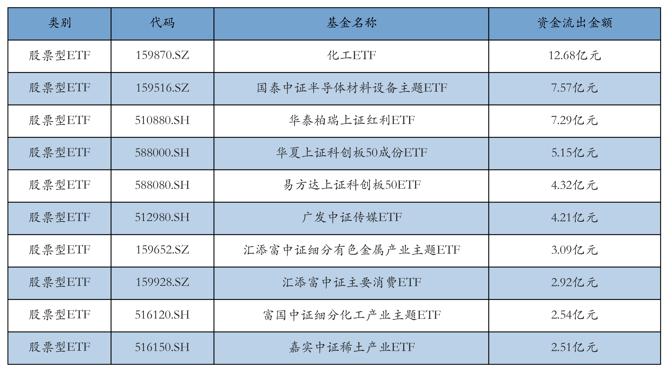 昨日股票型ETF资金流出最多的3只ETF及其流出金额分别为:化工ETF(流出12.68亿元)、国泰中证半导体材料设备主题ETF(流出7.57亿元)、华泰柏瑞上证红利ETF(流出7.29亿元)。资金流出前10详情见下表: