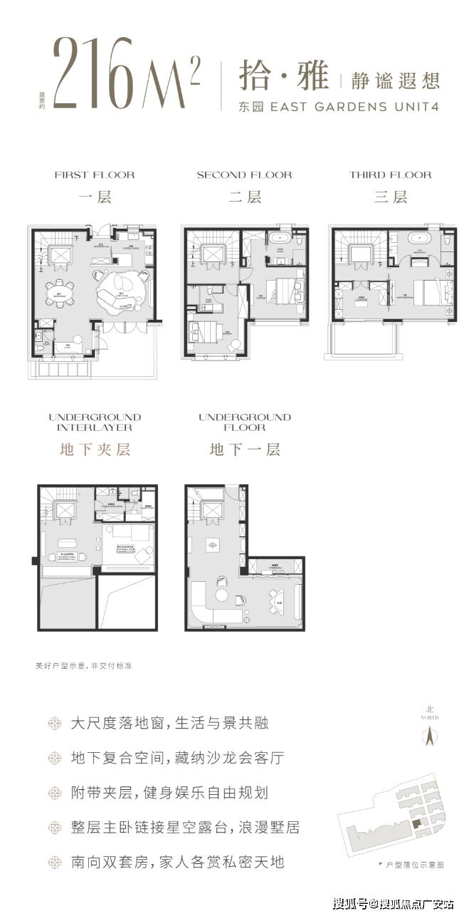 以建面216平户型为例,地面总高3层,地下一层5.5米带夹层,地下室面积就达到120m²,另外有露台、花园等,项目平均附赠也达到了约60%!