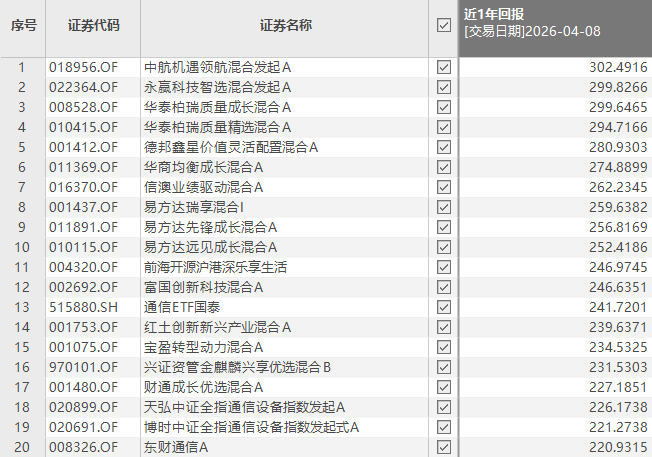 Choice数据显示,截至4月8日,中航机遇领航混合发起A近一年净值增长率为302.49%;永赢科技智选混合发起A、华泰柏瑞质量成长混合A、华泰柏瑞质量精选混合A等产品净值涨幅接近300%。