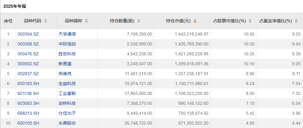 基金经理韩浩在基金年报中表示,组合以新质生产力为核心锚点,聚焦战略新兴产业的科技创新与产业升级主线,通过布局信息技术领域中的光通信、高端装备制造等方向,以获取超越基准的投资回报。