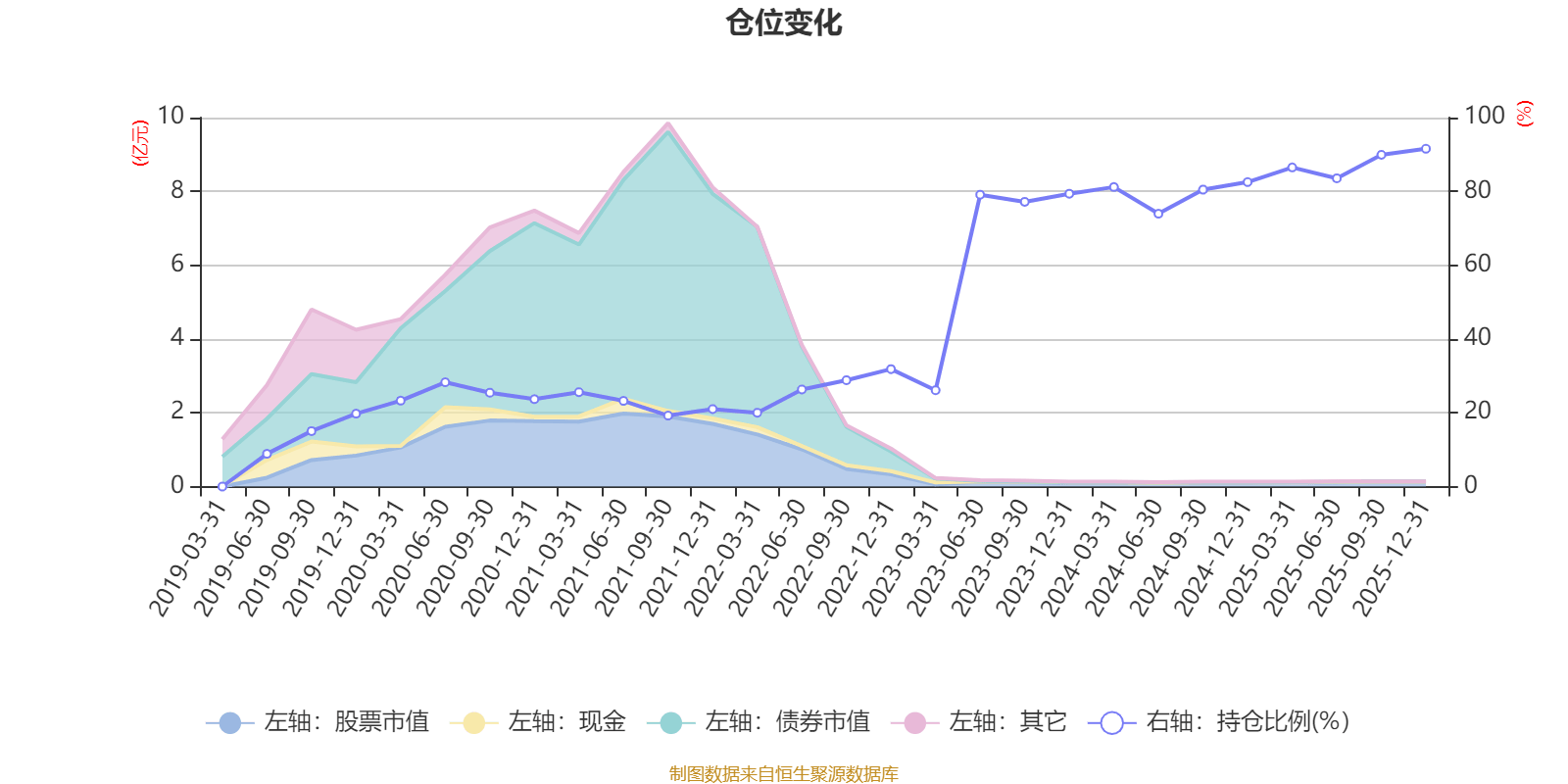 据定期报告数据统计,近三年平均股票仓位为77.62%,同类平均为72.57%。2025年末基金达到91.56%的最高仓位,2019年上半年末最低,为8.87%。