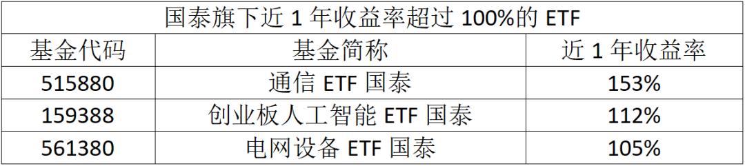 近一年来(2025年4月1日至2026年3月31日),A股市场震荡加剧、行业轮动加快,不同赛道表现差距很大,ETF产品业绩两极分化严重,收益率最高与最低产品差距达180个百分点。在这样的市场环境下,国泰基金旗下3只ETF净值翻倍,数量位居基金公司第一。