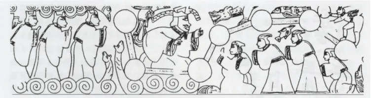 《春秋左传注·僖公三十三年》杨注曰:“古兵车若非将帅,则御者在中,射者在左,戈盾勇力之士在右。”车左(7号)也叫“甲首”,身背弓箭,负责远射。战车成熟配置所乘有三人,而此幅图像仅两人,可能是工匠的失误失绘,也可能是吸收胡人战车制度所制。亚述纳西帕尔二世(894—859BC)时期发现Nimrud的浮雕中表现战争的图像,战车的车舆中有两人,亦为一御一射。这也印证了学者罗琨研究战车起源,认为商代战车有可能来自西亚的观点。另外,由于战场环境变化与驾驭难度增加,自战国始,轺车作为战车的军事优势已不在,汉朝时,此战车已退出战争舞台。