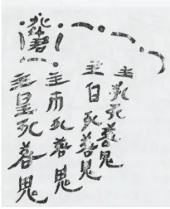 3号人物的身份需要先识读图像中的圆点。前文所论,这幅图像中有仙人,故此图应与仙界有关,据此我们可推测,图像中的圆点可能为星点。那么,这些星点是否为汉代时人观念中的某种星官?虽然画像绘制者绘制图像多为依据某种粉本,可能并不完全了解天文学,但对一些较为常见的星官却是较为熟稔的。这幅图像中星点共有七个,是否为汉代人所认知的北斗?在我国先民的认知中,北斗星有七颗,如在《史记·天官书》中记载:“北斗七星,所谓璇、玑、玉衡以齐七政”。北斗七星,在汉代墓葬资料中较为常见,有一些图像不仅七星的摆放位置与文献相互呼应,而且有的图像还标有题记。如长安县三里村出土一件朱书陶瓶(图5),绘制北斗七星,并在斗魁中有“北斗君”三字。山东嘉祥武氏祠前石室天井前坡画像的七星图像(图6),其也被视为北斗。除了解注瓶与画像石外,画像砖、壁画、带钩、厌胜钱、斗城、式盘等中均有北斗图像。通过对比可以发现,这些北斗图像与这幅图像中的星点摆放位置相差较大,因此判断这幅图像中的星点可能并非北斗。