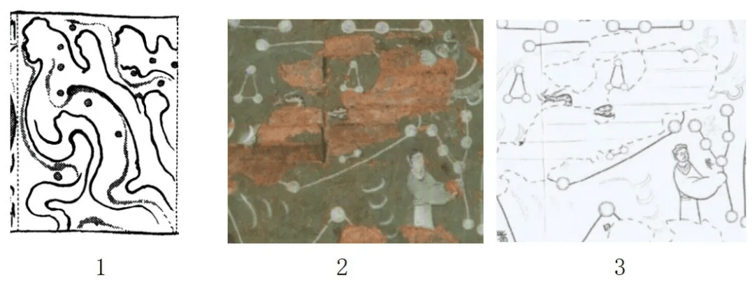 我们观察到这幅图像中的七个星点,被匈奴所驾驶战车分隔成五个与二个,上方的五个星点相倚构成一个五边形的框框,而在下方则散落两个星点。先讨论构成五边形框框的五星,在汉代墓葬中的星象图中,就发现有类似构造的星点。如洛阳西汉壁画墓主室顶脊上的十二幅日月星云图中,有一为靠近黄道的星象呈现为七星,其中西部偏北的五星构成一个五边形的框框(图
