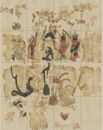 3号人物),不仅佩戴“山”字形冠,而且手持武器。此形象在汉代图像中亦有发现,这或可帮助我们进一步探讨3号人物在图像中的作用。湖南长沙马王堆三号墓东椁箱里一件黑色漆奁中,有一件破损严重的帛画(图8)。近年来,经过广濑薰雄和郑健飞等诸位先生的复原,有学者注意到主神与题记的关系。图画上部正中绘制有翼头戴鹿角样的神祇,其左侧有题记“太一将行”的字样,表明此神祇的身份可能为“太一”,其余神祇关系与之密切。