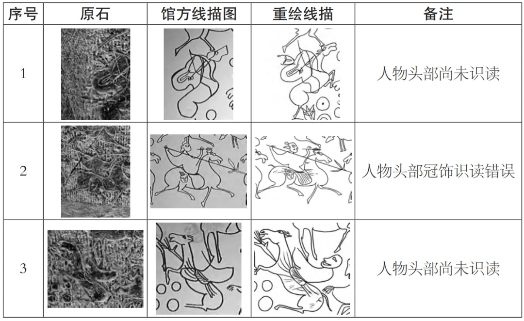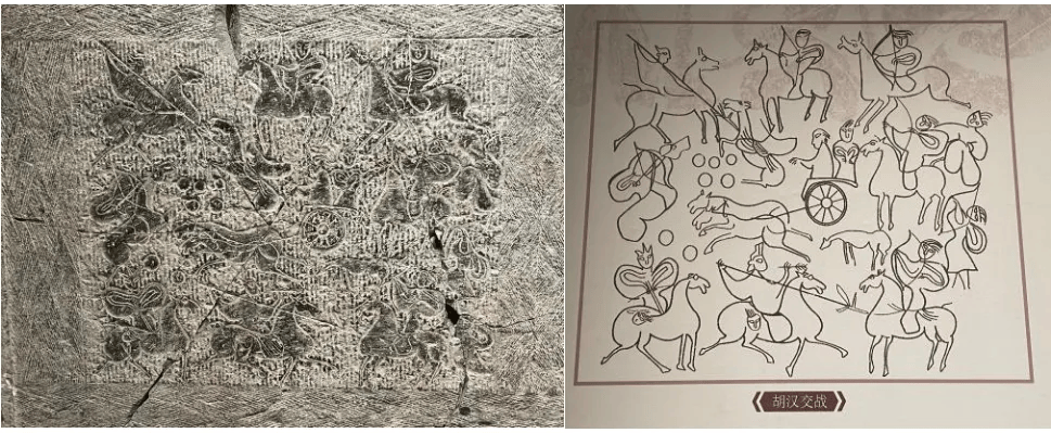 由于图像识读是这幅图像研究的基础,为更好识读笔者重绘线),故将此画像石椁侧板及其图像内容介绍如下。这幅画像石椁侧板分为三个画面,画面之间用菱形纹分隔,本文所论“胡汉交战”画像位于石椁侧板左侧,右方两幅图像分别为“楼阁比武”“乐舞百戏”。根据重制的线描图,这幅“胡汉交战”画像中的人物共有十三人,左右相向而行,分别有四人与九人。左方四人,面部造型奇特,冠饰形状各异,手中并持武器,有弓箭、弩机与戟等,均骑马向右行进。右方九人,人物面部均下巴略尖,下颌上翘,发型各异,分别有须蓬发、披发或光头,不著冠,深目高鼻,所乘有马、车等,并有两人徒步,均向左行进。右方人物中,除有一人御车,其余均手持弓箭。在右方人物中,还有一向左行进的小型动物,似犬。在双方人物中间,还分布着七个圆点,被右方驾驭马车按照五、二分割。