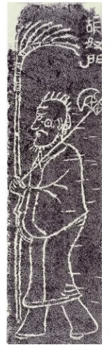3),其中1号—4号人物为左方向右行进,5号—13号人物为右方向左行进。5号—13号人物下巴略尖,下颌上翘,发型多样,有须蓬发、披发或光头等,不著冠,深目高鼻。有这些特征的形象在汉代图像中不多见,目前仅见四处,其中河南一处,陕北有三处,分布较为零散。研究汉画的学者,多称披发的形象为胡人,但其具体族属多语焉不详。目前来看,披发的形象普遍见于北方整个草原地带,并不能作为判断族属的唯一依据。好在河南方城县博物馆藏1934年方城县杨集乡余庄村出土的画像石,其中“胡奴门”题刻(图4),为我们判断胡人族属提供依据。有学者从语言学的角度分析,判断秦汉时期的“胡”族属,其中陈寅恪与日本学者白鸟库吉等认为“胡”特指“匈奴”。吕思勉也认为:“胡之名,初本专指匈奴,后乃她为北族通称。”俞伟超亦指出,汉画像描绘的“战争”,仅仅是西汉与匈奴之间的战事,不见于东汉中期之后的故事。结合目前图像信息与诸多史家的研究,本文将其暂定为匈奴。