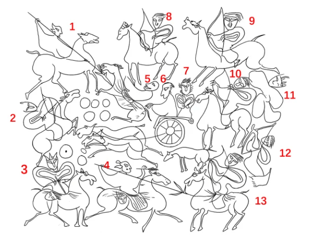 号、12号人物徒步,并作拉弓射箭状,这两人应为隶属于战车的车徒,身份不高,配合战车作战。《春秋左传注·隐公四年》杨注曰:“徒兵即步卒,在车下作战者。”囿于国家垄断,先进的战车,精良的弓箭、戈、戟等武器,乃贵族阶层的专属。平民与奴隶只能充当步兵,辅助贵族之间的车战。8号、9号、10号、13号人物,均表现为骑射形态,其与匈奴及北方诸多游牧民族的作战方式相符合。其中匈奴多以骑射为主,因此还被称为“控弦之士”。